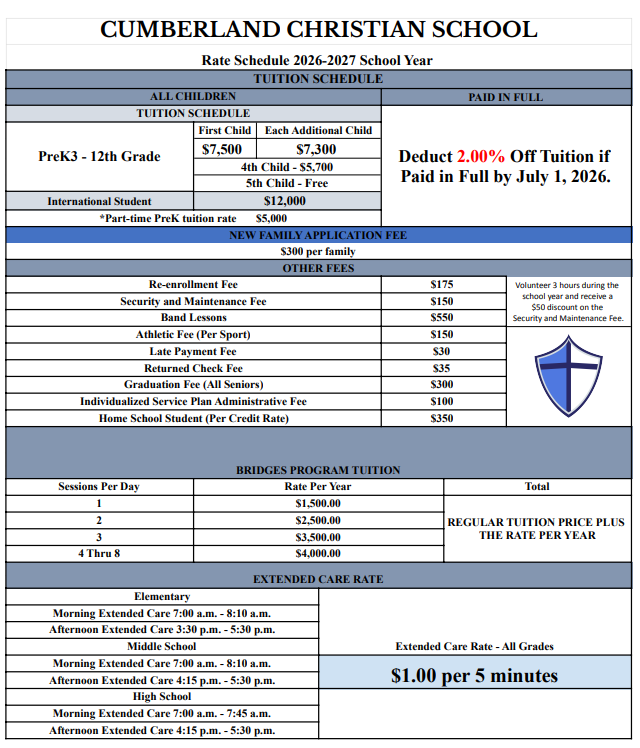 Every possible effort is made at CCS to keep tuition as affordable as possible. At the same time, it is the desire of Cumberland Christian School to provide a quality Christian education.